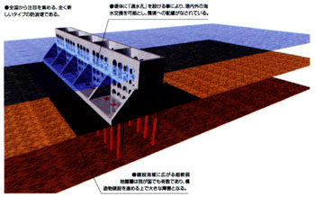 厳しい自然条件に対応するとともに自然環境への負荷を極力抑えるために、熊本港の建設においては様々な新技術が導入されています。そのひとつが「軟弱地盤着底式防波堤」(略称:軟着堤)です。日本で初めて導入されたこの技術は、堤体の重量を軽くし、底版の幅を広くすることで軟弱な地盤にかかる荷重を小さくしたもので、地盤改良を必要とせず工期や建設コストの大幅な低減を実現しました。また、堤体に通水孔を設けることにより、港内外の海水交換を行う機能も備えています。