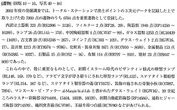 2002年度は、城塞内部のモスクの南東方にある建造物ブロック15と北東方にある建造物ブロック18、両建造物ブロック2を囲む街路、そして正門第2門から中央街路(カラー図版1−2)を精査した(図版5)。
