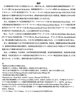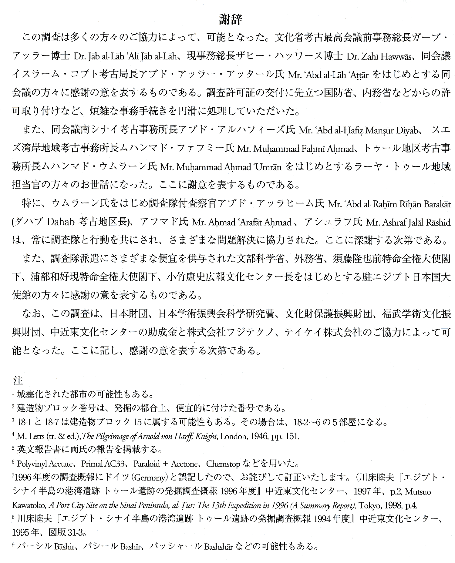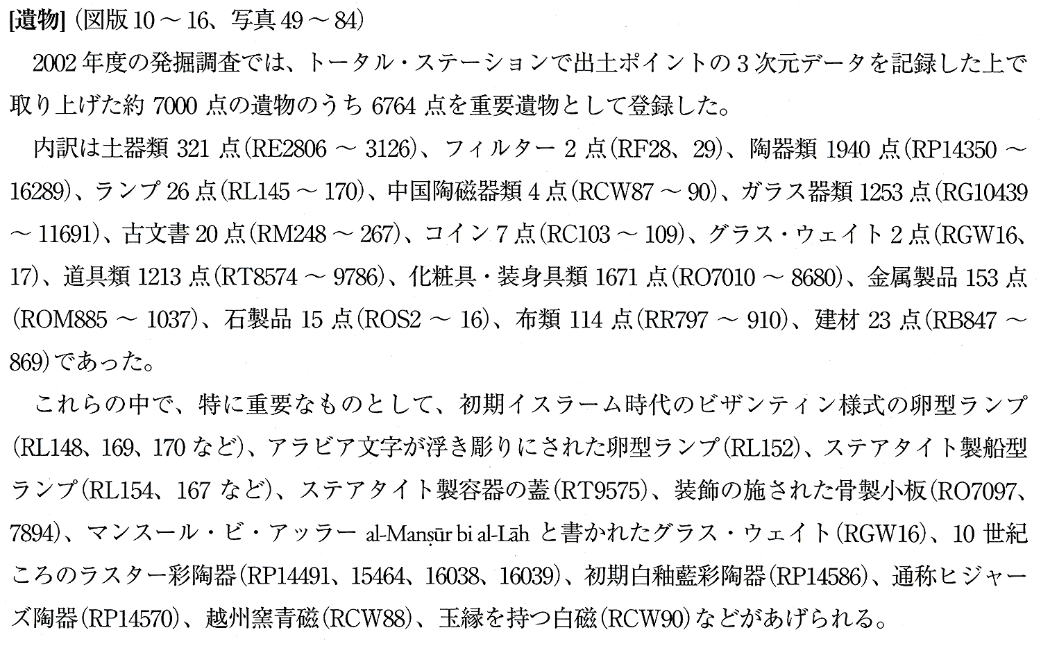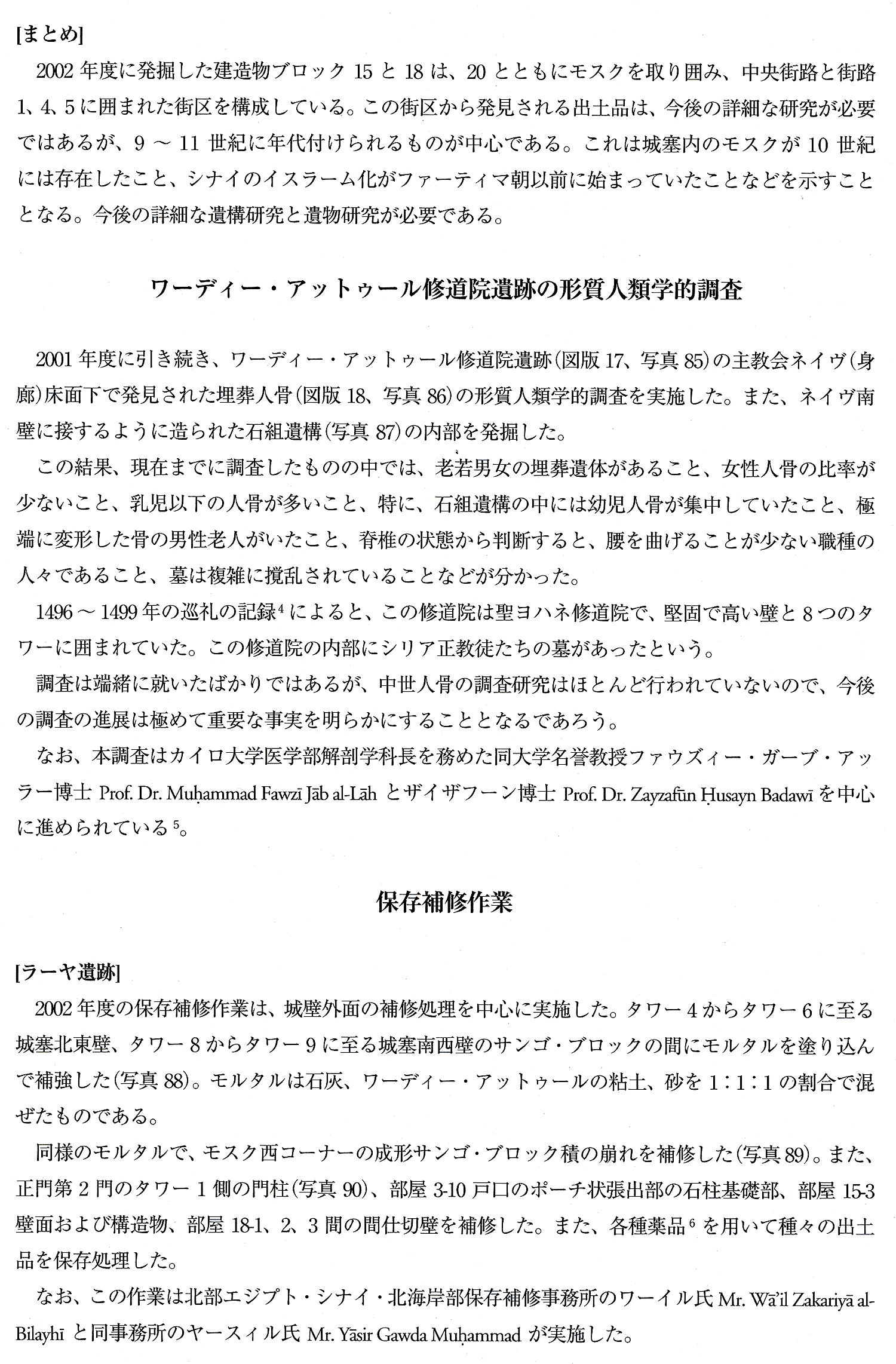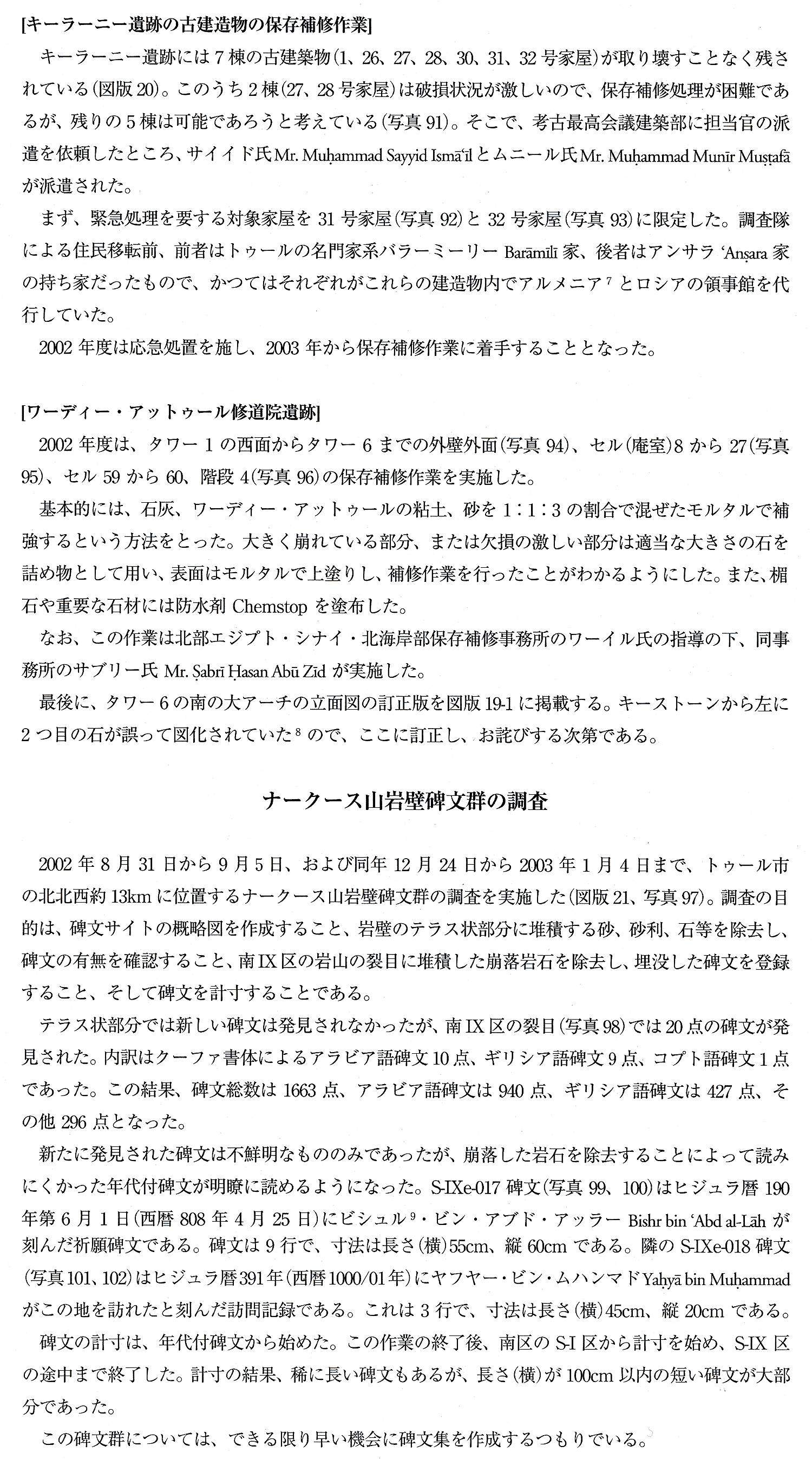 この目的を達成するために、2002年7月27日から9月12日、そして12月24日から2003年1月4日まで、ラーヤ・トゥール地域(図版1、2、カラー図版1−1)の考古学的調査を実施した。港市ラーヤ遺跡の発掘調査(第6次)、ワーディー・アットゥール修道院遺跡の形質人類学的調査(第2次)、両遺跡の保存補修作業、港市キーラーニー遺跡上の近現代建造物の保存補修計画、ナークース山岩壁碑文群調査(第2、3次)、そして出土遺物の整理・研究を実施した。また、モスクから発見された数千点におよぶ壁画片の接合作業を実施した(43〜51頁)。さらに、調査期間中にポータブル蛍光X線分析装置を用いて、ガラス、コイン、壁画顔料、陶器の化学分析を行った(53〜65頁)。