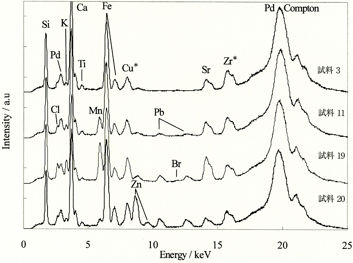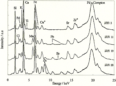 図1. 出土ガラスの蛍光X線スペクトルの例