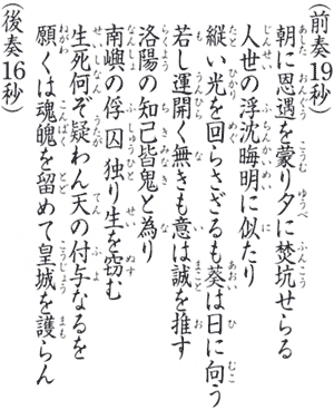 このような彼の人生観が、この詩には深くきざまれているが、直接的な詩文の意味は次のようである。『人の生涯には、或るときは身にあまる手厚い扱いを受けることもあるが、反対に中国の故事に云う焚書抗儒の如く酷い仕打ちを受けることもある。こうした浮き沈みは、なんともままならぬもので、一日の中でも暗い夜もあれば明るい昼もめぐってくるようなものであろう。しかし向日葵(ひまわり)の花は、たとえ太陽が照らない時でも、必ず太陽に向いて花を開くように、自分が運わるく、この島の牢で生涯を送ったとしても、この忠誠心は変ることはない。今回京都では多くの同志が大獄の難に殉じたが、自分だけは南の島に囚われの身となって生き長らえている。然し、もともと人間の生死は天が与えたものだから何んとも致し難く、もし自分が死んでも、我が魂はこの世にとどまって皇室をお守りしようと心に誓っている』と云うもの。
