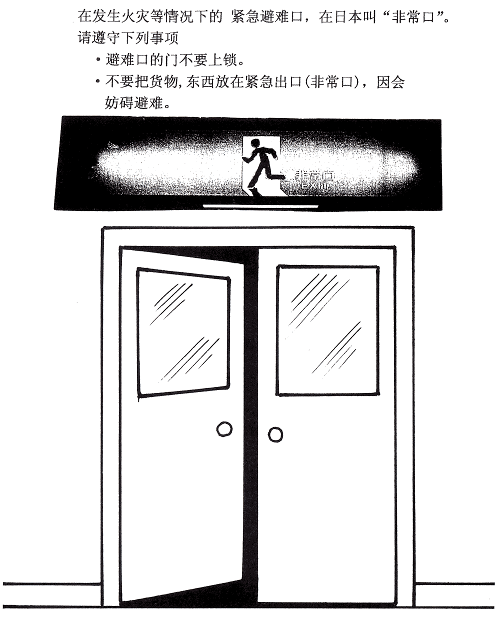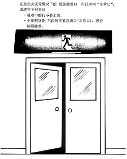 火災時、緊急避難口が非常口です。次の事を守ってください。