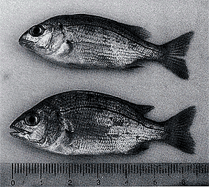 次は餌についてですが、前にも述べたように飼育当初はワムシを与えます。続いて仔魚の成長に合わせて孵化後二〇日過ぎからアルテミアという、やや大きめ(〇・五mm)の動物性プランクトンと配合飼料を与えました。動物性プランクトンは、どちらもよく動くのでクロダイは喜んで食べてくれます。餌の量は毎日数回、飼育水中の餌の残量を調べて決めました。一方、配合飼料の方は与え始めてしばらくは食べているのかどうかよくわかりません。ずっと後の全長二〇mm位になって配合飼料をまくと積極的に食べに来るのでわかるのですが。ちなみにクロダイ仔魚の特徴はマダイ仔魚に比べ体が細長く、面長です。