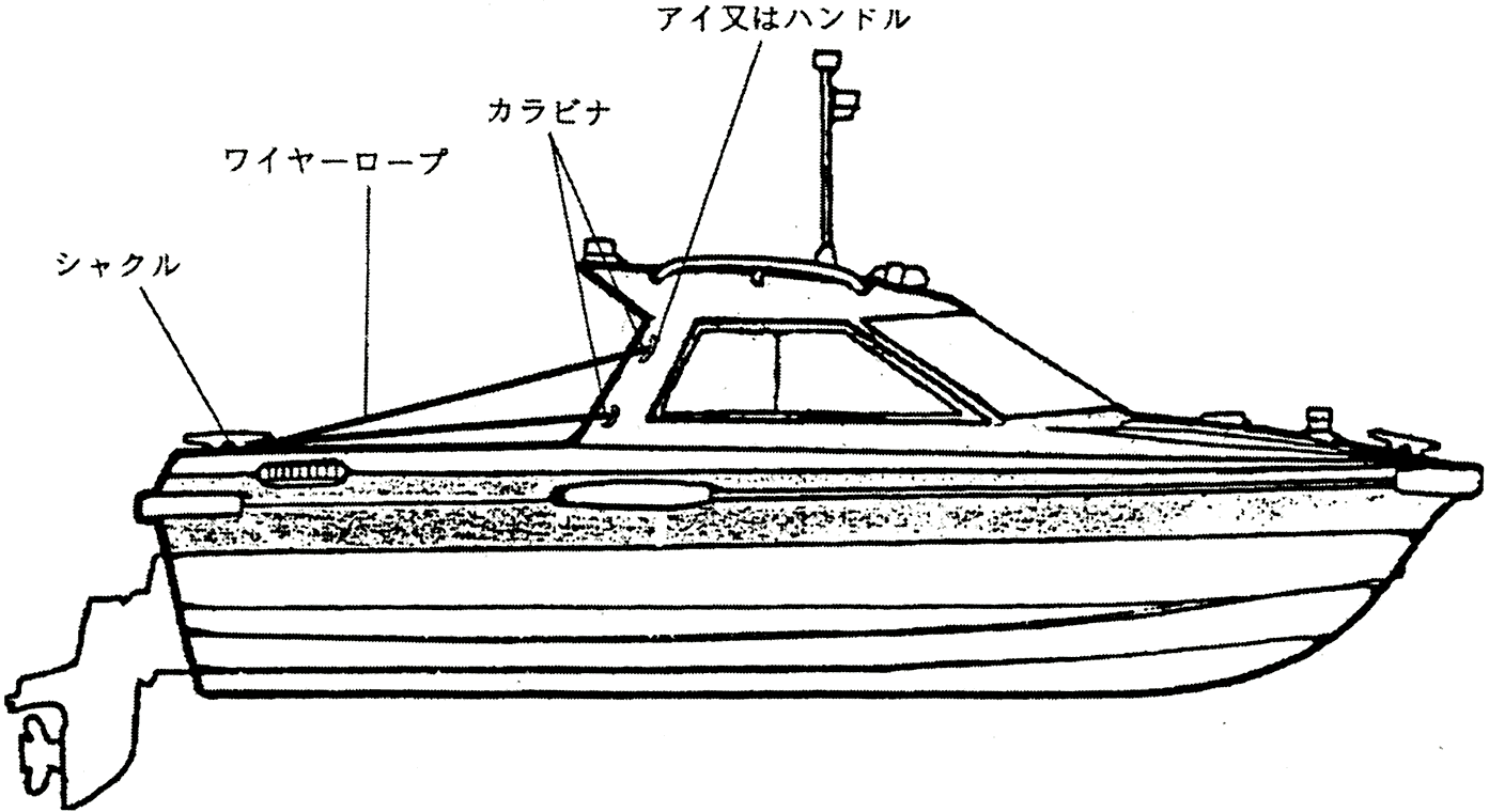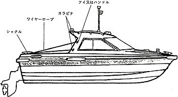 では、先のライフラインはどうするかと言いますと、ビニール巻きワイヤーの片方を船尾のクリートにシャックルで取り付け、ワイヤーのもう片方を船体中央のキャノピー後部の立ち上がり部に取り付けたアイまたはハンドルにカラビナで引っかければ案外手軽に出来るのではないでしょうか。