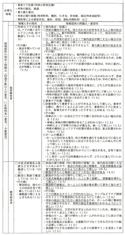 通路・階段・エスカレーター・トイレ等については、各施設への誘導方法や駅員の対応などが問題となっており、音声による案内誘導、駅員による接遇の向上、視覚障害者誘導用ブロックやサインの適切な設置などについて留意する必要がある。