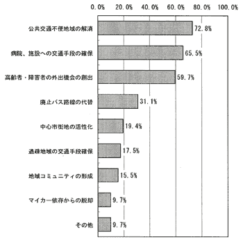 コミュニティバスの運行目的で最も多いのは、「公共交通不便地域の解消(72.8%)」であり、次いで「病院、施設への交通手段の確保(65.5%)」、「高齢者・障害者の外出機会の創出(59.7%)」が5割以上となっている。