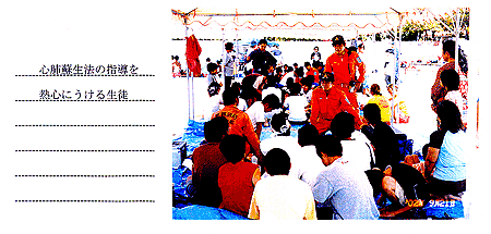 心肺蘇生法の指導を熱心にうける生徒