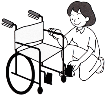 b. シートを広げます。(広げる時に車輪に指をはさまないように注意します。)利用者が乗ってから、フットレスト(足を乗せる部分)を完全に下ろします。