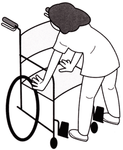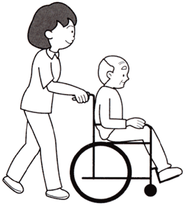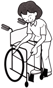 a. 車いすの真後ろに立ち、両手でハンドグリップ(介助用にぎり)をしっかり握り、前後左右に注意して利用者に声をかけてゆっくり押します。