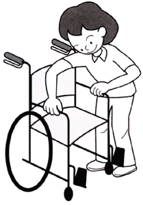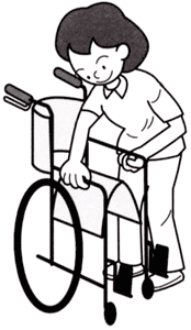 a. 車いすの横に立ち、片手でハンドグリップを握り、もう片方の手でサイドブレーキをかけます。反対側も同じようにサイドブレーキをかけます。短い時間でも、必ず両側のブレーキをかけます。