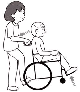 a. 利用者をシートに深く座らせ、必要に応じて固定ベルトを着用させます。利用者にキャスター上げを行うことを伝え、了解を得た上で、実際に動かすときも「キャスターを上げますよ」といった言葉をかけます。