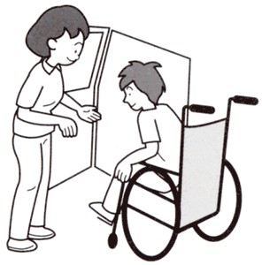 a. 車いすを約30度の角度になるよう車につけます。ブレーキをかけ、足を床におろしてフットレストを上げます。