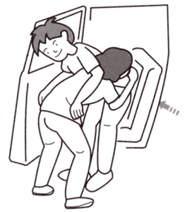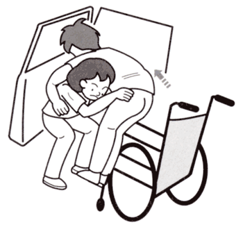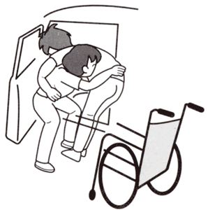 b. おしりを手前に移動させ車と反対側のわきの下に身体を入れ、利用者の下半身をもたせかけます。両手で利用者のベルト部分をにぎります。
