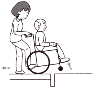 a. 車いすを後ろ向きにし、ブレーキをかけて安全を確認します。