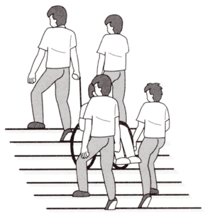 b. 介助者は、各自持ち場につき、車いすを持ち上げます。