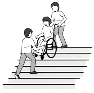 d. 後輪が階段にかかるようにして一段一段リズミカルに、衝撃を与えないように下ろします。