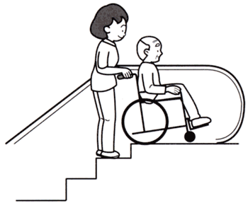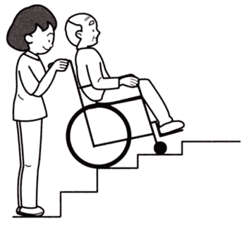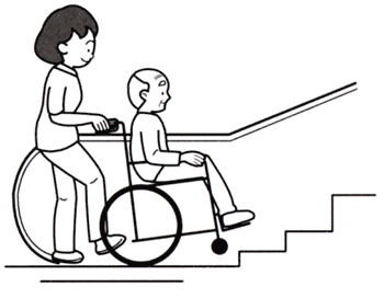 a. キャスターを上げて、後ろ向きに乗り、ステップが階段になったら車いすを押して動かないように固定します。