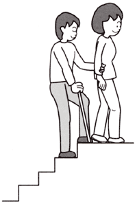 (4)白杖は上がるときは短く、降りる時は少し長めに持たせ、身体のななめ前方にかまえて衝突を防ぎます。視覚障害者が手すりを持ちたいと言った場合は、あいてる手で手すりにつかまらせて、階段を昇降します。