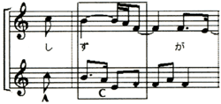 18例をこの3種に分け、歌との関わりを見ると表2のようになる。表からわかるように、Aの定型旋律は歌詞の区切りの終わり部分で歌の定型旋律と結びつく例が多く、譜のような比較的長い旋律を形成している。