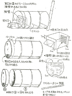 横型ドラム缶窯には最もオーソドックスな、焚き口を外につけるタイプ(標準タイプ)と、焚き口をドラム缶の中に一体型として設置する、障壁のあるタイプ(改良タイプ)の2種類がある(41、43頁参照)。