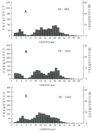 1996年宍道湖のシジミ漁場のヤマトシジミ生貝殻長組成(1996年8月16、17日調査)