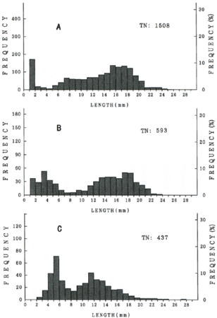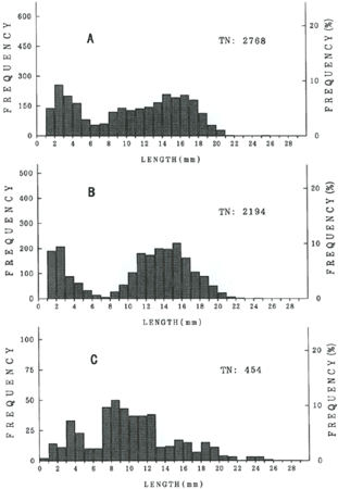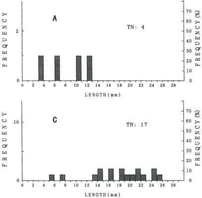 1996年宍道湖のシジミ漁場のヤマトシジミ斃死貝殻長組成(1996年8月16、17日調査)