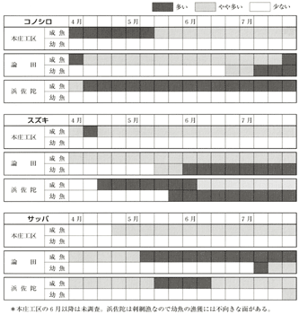 表−4 諭田におけるコノシロ・スズキ・サッパの動き(ます網)