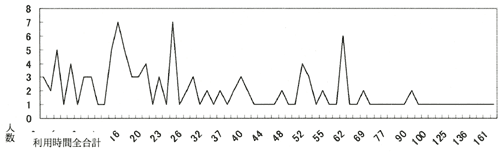 最も多いのは720時間(1日24時間×30日)と230時間〜240時間(1日約8時間×30日)の利用者。平均利用時間と、日常生活動作、居住形態、性別が統計的に有意な関連を持つ。日常生活動作では、全体介助の必要な人ほど平均利用時間は長くなる( CIL版図12)。居住形態では、一人暮しの人の平均利用時間が長い( CIL版表2)。また性別では、女性の方が平均利用時間が長い( CIL版表4)。