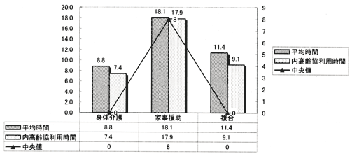 [高齢協]利用時間の内訳では、「家事援助」の平均時間が18.1時間で最も多い。全体の利用時間の中で、高齢協が、それぞれの利用時間の8割以上を提供しており、特に「家事援助」では、99%を占めている。