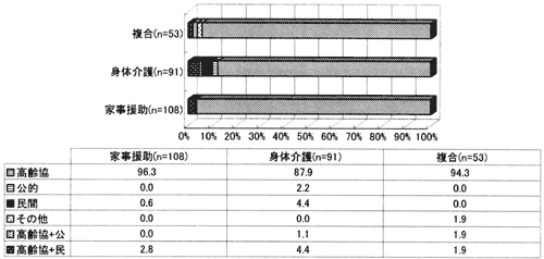 [高齢協]家事援助で96.3%、身体介護で87.9%、複合型で94.3%の人が高齢協からのみサービスを利用している。介護保険外では、高齢協のみからサービスを受けている人の割合が非常に高い(身体介護および複合型で高齢協のみが100%、家事援助で93.8%)。障害の重い人ほど、高齢協と他の団体を組み合わせて利用している( 高齢協版図17)。