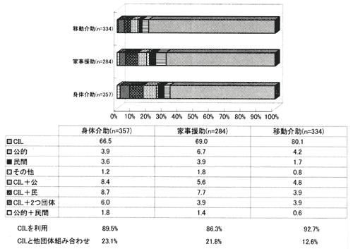 [CIL]身体介助で66.5%、家事援助で69%、移動介助で80.1%の人が自立生活センターからのみサービスを利用している。身体介助、家事援助では2割以上の人が、公的団体、民間団体と自立生活センターを組み合わせてサービスを受けている。