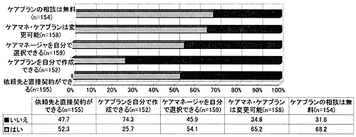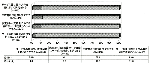[CIL]77%の人が支援費制度の主な特徴を全て把握している。全く知らない人は、2.4%のみ。合計利用時間の多い人ほど、支援費制度について把握しており( CIL版図20)、居住形態では、親族と同居し親族から介助を受けている人の認知度が低い( CIL版表5)。