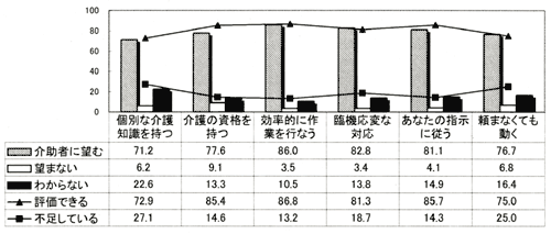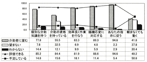 [CIL]介助者の評価は概して高い。介助者に望むのは、「指示に従う」「臨機応変な対応」「効率よく作業する」「一般的ではなく本人の介助に関して十分な知識を持つ」。要望が低いのは、「介助の資格を有する」「頼まなくても動く」。利用者からの要望は低いが、介助者はそれでも有資格者が多い。