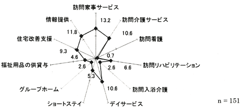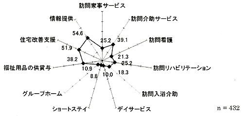 [CIL]「年齢」、「居住形態」、「一人暮らしの年数」、「日常生活動作」、「介助サービス合計利用時間」と充実を望むサービスの間には、有意な関連がある。「年齢」が高い人は、「訪問リハビリテーション」を、低い人は「情報提供」を、「居住形態」では、一人暮らしの人が「訪問看護」、「訪問リハビリテーション」を、親族が介助者で同居している人は、高齢者と同様「ショートステイ」を、「1人暮らし」の年数が長い人は、「訪問家事」を、短い人は「福祉用品の供貸与」を、「日常生活動作」で介助が必要な程度が重い人ほど、「訪問看護」「訪問入浴」を、「介助サービス合計利用時間」が多い人ほど、「訪問リハビリテーション」と「住宅改善支援」を望む傾向にある。