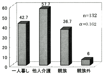 1人暮らしの人に比べ、同居する親族から主に介護を受けている人の障害が重いが( 高齢協版図8参照)、1人暮らしの人の利用時間の方が長いことから、親族がかなりの介護を提供していることが推測できる。