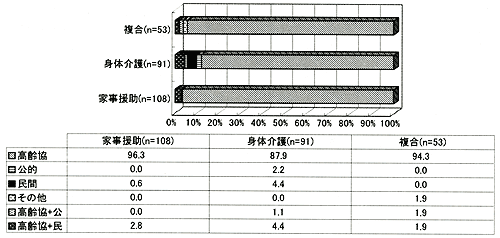 「身体介護」では、最大115時間、平均8.8時間、全体の84.2%は、高齢協の介護サービスを利用している。「家事援助」では、最大158時間、平均18.1時間、全体の99%が高齢協。複合では、最大135時間、平均11.4時間、全体の80.1%が高齢協を利用している。