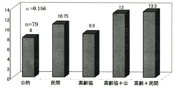 障害の重い人ほど、高齢協と他の団体を組み合わせて利用している傾向がある。民間の利用者が最も障害が重く、公的サービスの利用者が最も障害が軽い(図17)。