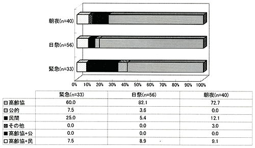 緊急時には、民間を利用している人が20%におよぶ。また、高齢協と民間サービスを組み合わせている人が1割弱いる。
