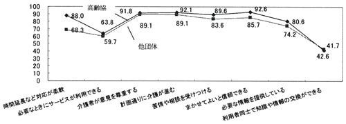 高齢協への評価は高い。それぞれの項目では、平均して80%の人が満足している。25.3%の人が全ての点において満足。最も評価が高いのは、「まかせてよいと信頼できる」「計画通りに介護が進む」点であり、一方他の項目と比較すると、「必要なときにサービスが利用できる」63.8%、特に「利用者どうしで知識や情報の交換ができる」は41.7%と評価が低い。