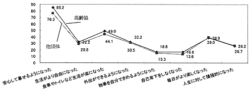 高齢協のサービスを利用して最も変化したと評価されているのは、「安心して暮らせるようになった」ことである。85.2%の人がこの点を評価している。次いで、「食事やトイレなど生活が楽になった」とする人が、半数近くいる。