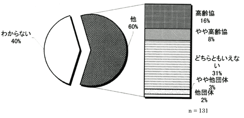 評価した人のうち、16%の人が高齢協の方がいいと評価している。全体で40%の人が「他の団体を利用した経験がないからわからない」とし、評価不可能。