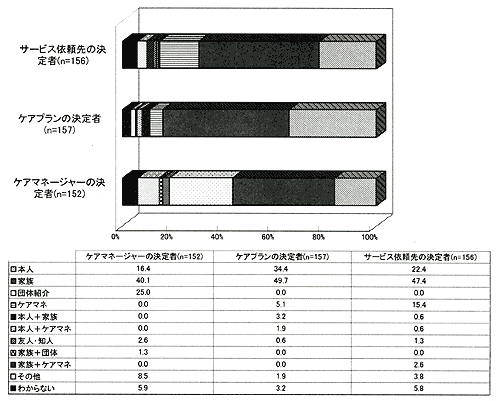 「家族」の割合がどの決定に対しても最も高い。依頼先の決定で47.4%、介護内容の決定で49.7%、ケアマネージャーの決定で40.1%。介護内容の決定では「本人」(34.4%)が次に来るが、依頼先の決定では「ケアマネージャー」15.4%、ケアマネージャーの決定では、「サービス依頼先団体の紹介」が25%で2番目に多くなる。