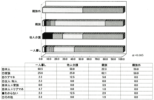 1人暮らしおよび親族と同居しながら他人介護を主に受けている人では、「本人」(60.5%)が介護内容を決めた割合が高い。一方、主に介護を受ける親族と同居している人では、「家族」が介護内容を決定した割合が高い(図30)。