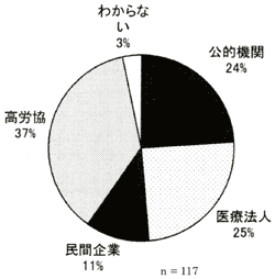「高齢協」が36.8%で最多。ついで、「医療法人」24.8%、「公的機関」23.9%、「民間企業」11.1%。ケアマネージャーの所属先を知らない人が3.4%いる。