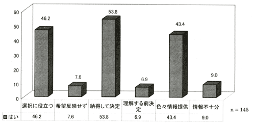 「選択に役立った」「納得して決めることができた」「色々と情報提供があった」の、肯定的な評価は半数程度。1割弱の利用者が「希望が反映しなかった」「理解する前に決定された」「情報が不十分であった」の否定的評価をしている。「納得して決めることができた」とするのは、53.8%で半数強。一方で、9%の人が「情報が不十分であった」と評価している。