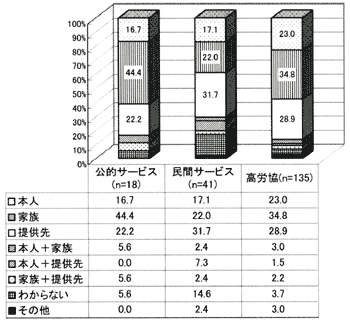公的団体と高齢協のサービス利用では「家族」(34.8%)が、民間サービスの利用では「提供先」(31.7%)の割合が最も高い。また、高齢協では、本人(23%)の割合が他と比べ高い。