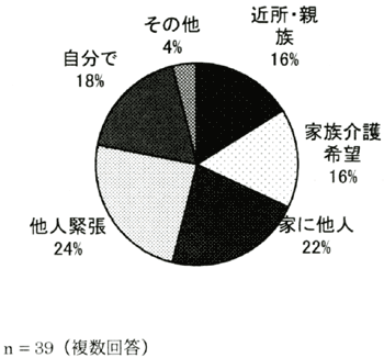 抵抗感の理由として順に、「他人と接するのは緊張する」(24%)、「自宅に他人が入るのに抵抗がある」(22%)、「できるだけ自分でやりたい」(18%)、「家族介護のほうがいい」(16%)、「近所・親族の手前利用しにくい」(16%)となっている。