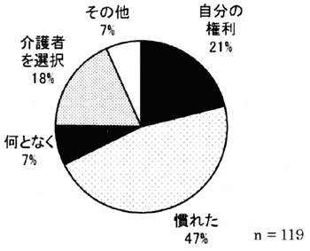 「慣れたので感じない」を抵抗感の理由とする人が47%。次に、「介護サービスは自分の権利だから」21%、「抵抗感のない介護者を選んでいるから」が18%の順で割合が高くなっている。
