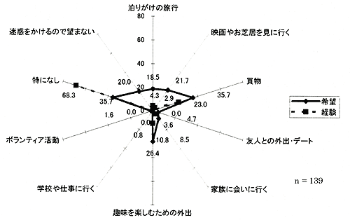 「買物」「趣味を楽しむための外出」「映画やお芝居を見に行く」「泊りがけの旅行」を希望する人の割合が高い。一方で、35.7%の人が特に希望はなく、20%の人が「迷惑をかけるので望まない」を選択している。