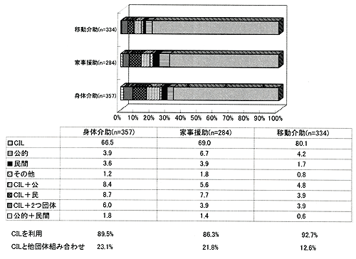 身体介助、家事援助では2割以上の人が、公的団体、民間団体と自立生活センターを組み合わせてサービスを受けている。